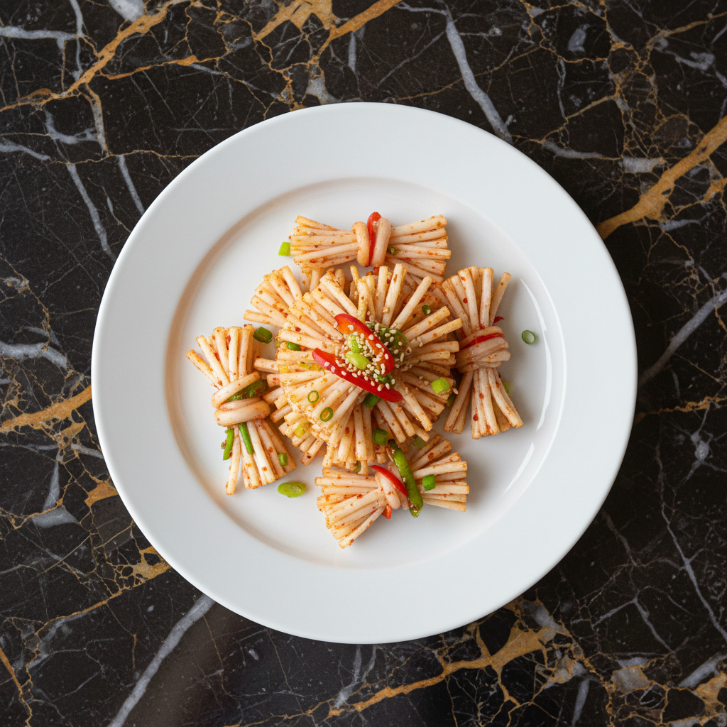 Doraji Namul is a classic Korean banchan (side dish) made from seasoned bellflower root. This preparation highlights the root's unique crunchy texture and slightly bitter, earthy flavor, often enjoyed during holidays and special occasions. The salting process is key to mellowing its bitterness.