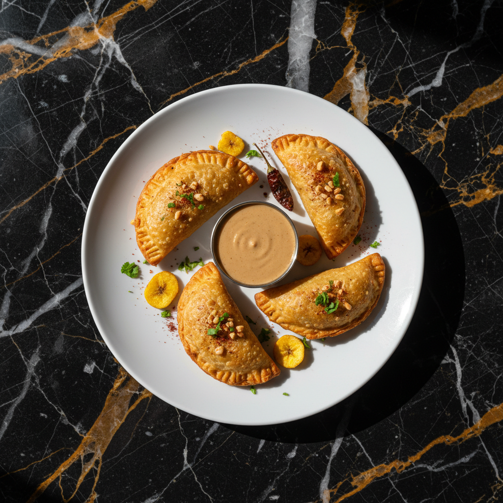 Authentic Cauca-style empanadas featuring a savory filling of mashed potatoes and a rich, spiced peanut sauce, encased in a crispy corn masa shell. A beloved Colombian street food.