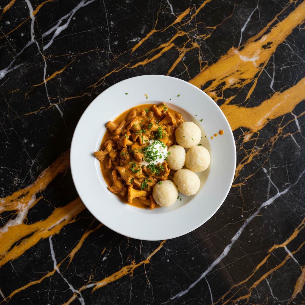 A rich and creamy vegetarian goulash featuring the distinct flavor of chanterelle mushrooms (Eierschwammerl), simmered in a paprika-infused sauce. This hearty dish is a delightful way to enjoy seasonal mushrooms and is traditionally served with bread dumplings or potatoes.