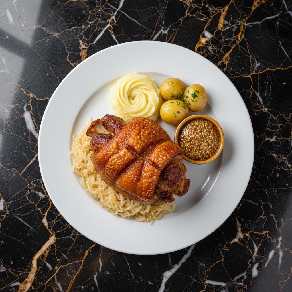 A classic German beer hall dish featuring tender, slow-cooked pork knuckles, traditionally boiled and sometimes finished with a crispy roast. Served with hearty sauerkraut and sharp mustard.
