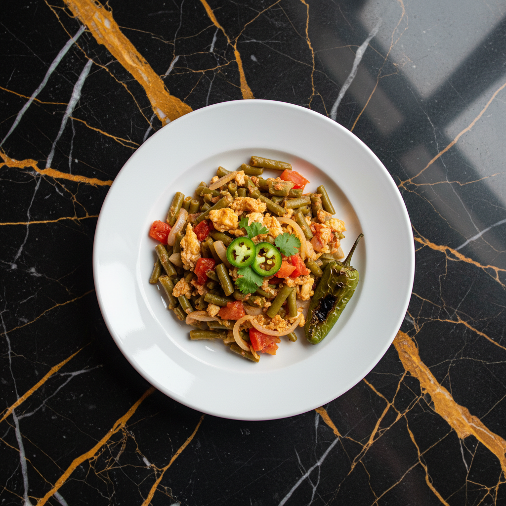 A simple yet flavorful side dish of stewed green beans, often prepared with tomatoes, onions, and sometimes eggs, showcasing the fresh produce of Honduras.