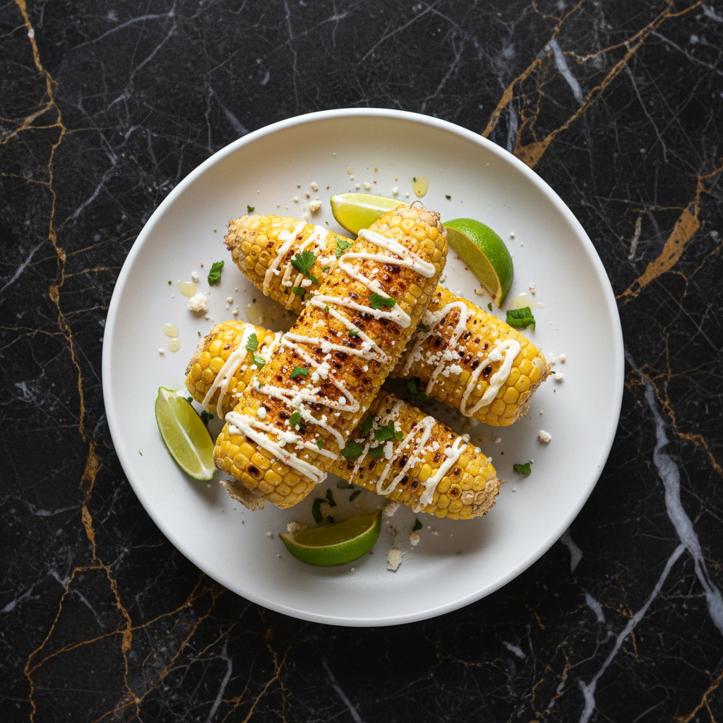A vibrant and flavorful Mexican street food classic. Grilled corn on the cob is generously coated in creamy mayonnaise, then rolled in salty cotija cheese and dusted with a hint of spicy chile powder, finished with a refreshing squeeze of lime.