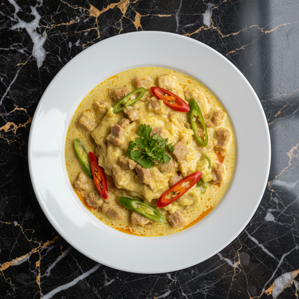 A variation of the national dish Ema Datshi, this version incorporates tender pieces of pork, making it a more substantial and flavorful meal. It's a spicy, cheesy stew that is a staple in Bhutanese cuisine.