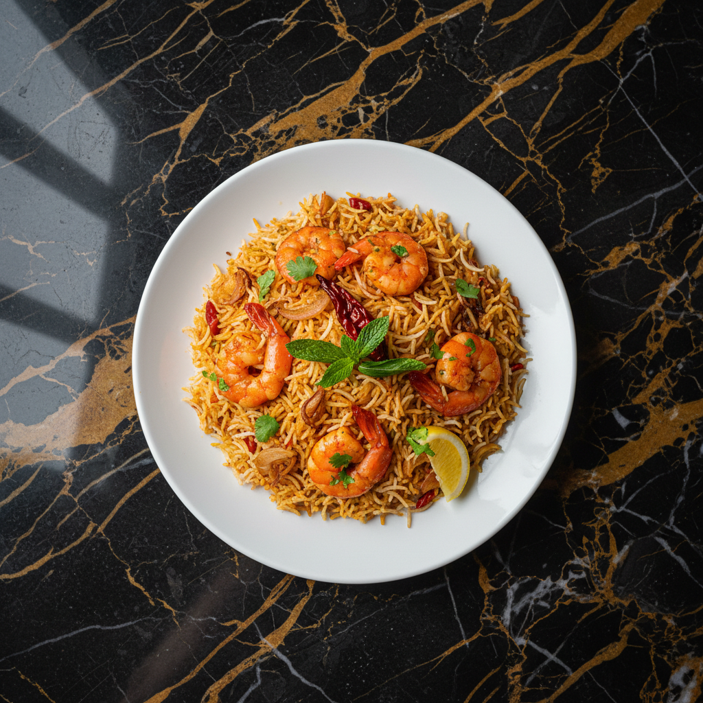 A fragrant and flavorful biryani featuring succulent shrimp cooked with aromatic basmati rice, a medley of spices, and fresh herbs, showcasing a coastal influence in Emirati cuisine.