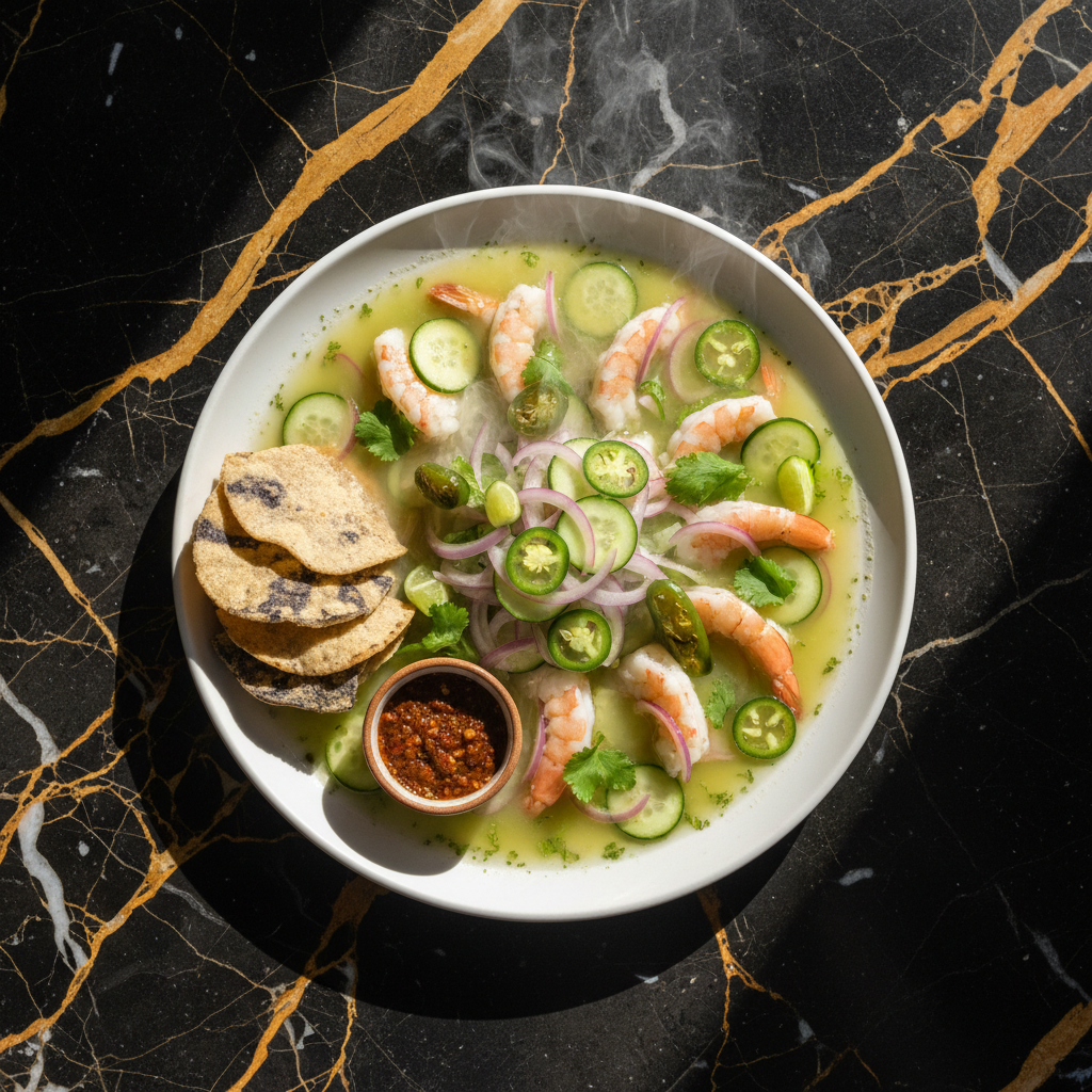 A vibrant and refreshing raw shrimp dish from Sinaloa, Mexico, where shrimp are 'cooked' in a zesty marinade of lime juice and fiery serrano chilies. This dish is known for its intense spiciness and is often served as a refreshing appetizer or light meal.