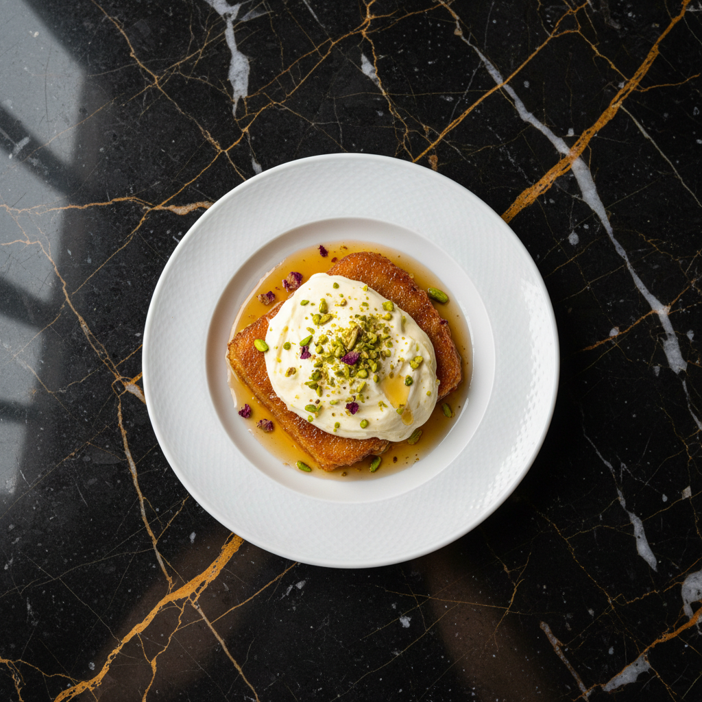 Aish El Saraya, meaning 'palace bread,' is a beloved Middle Eastern dessert featuring layers of toasted bread soaked in a fragrant syrup, topped with a creamy custard (ashta), and often garnished with pistachios. It's a rich and decadent dessert perfect for special occasions.