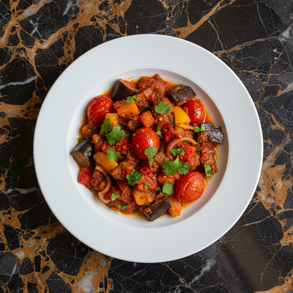 A vibrant and hearty vegetable stew, often referred to as Georgian ratatouille, featuring eggplant, tomatoes, bell peppers, and herbs.