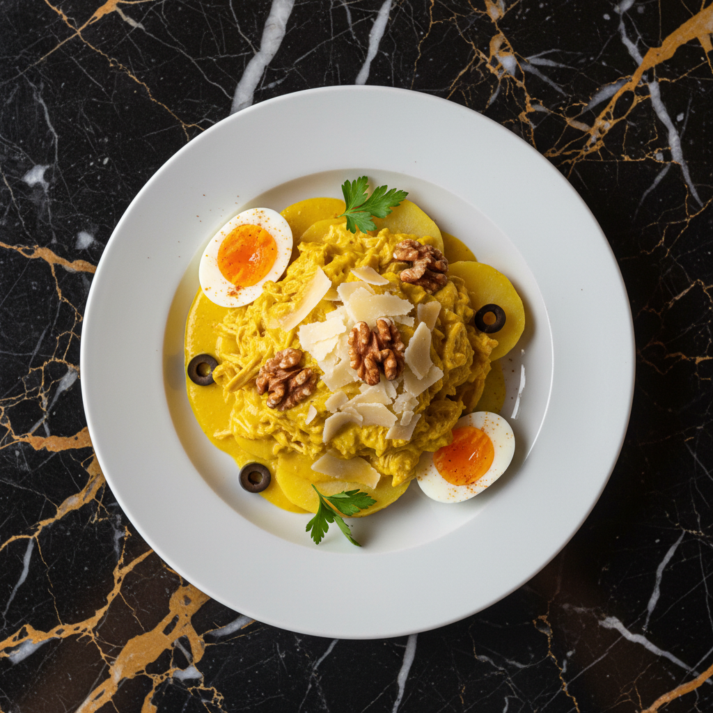 A classic Peruvian comfort food, Ají de Gallina features tender shredded chicken bathed in a rich, creamy, and subtly spicy sauce made from ají amarillo peppers, blended with bread, walnuts, and Parmesan cheese. It's traditionally served over boiled potatoes.