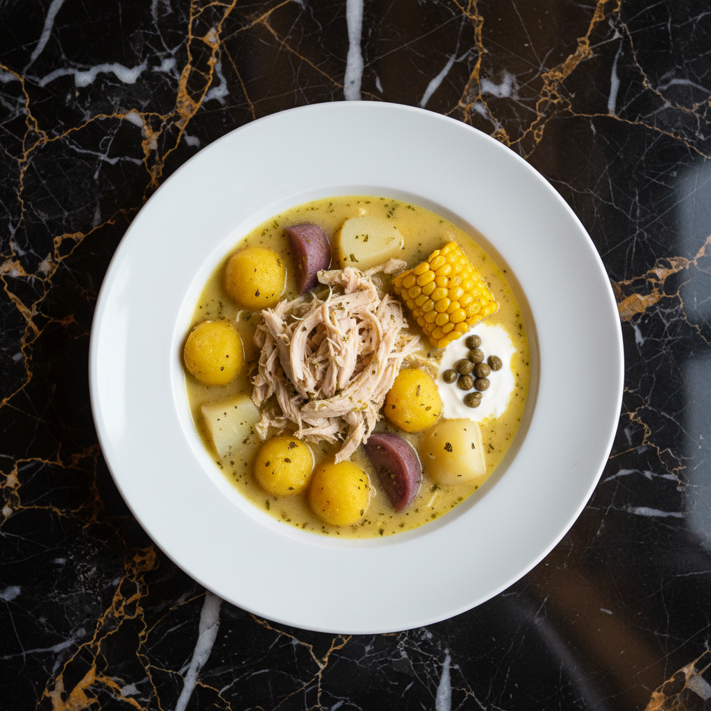 A hearty and traditional Bogotá chicken soup featuring three types of potatoes, tender shredded chicken, and the distinctive aroma of the guasca herb. This comforting soup is a staple in Colombian cuisine.