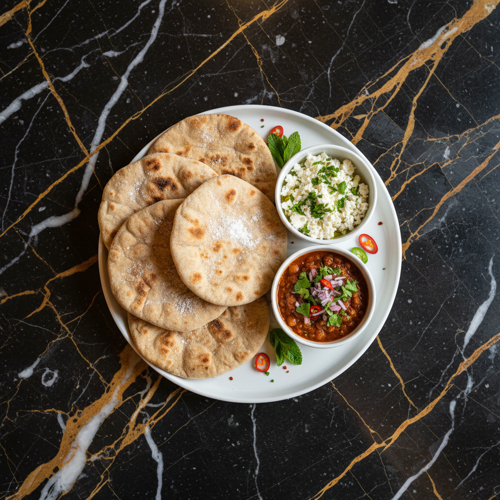 Aish Baladi is the quintessential Egyptian whole wheat flatbread, often referred to as the 'daily bread'. This rustic pita-style bread is known for its characteristic puff during baking, which creates a natural pocket, making it perfect for scooping or filling. It's a simple yet essential staple in Egyptian cuisine.