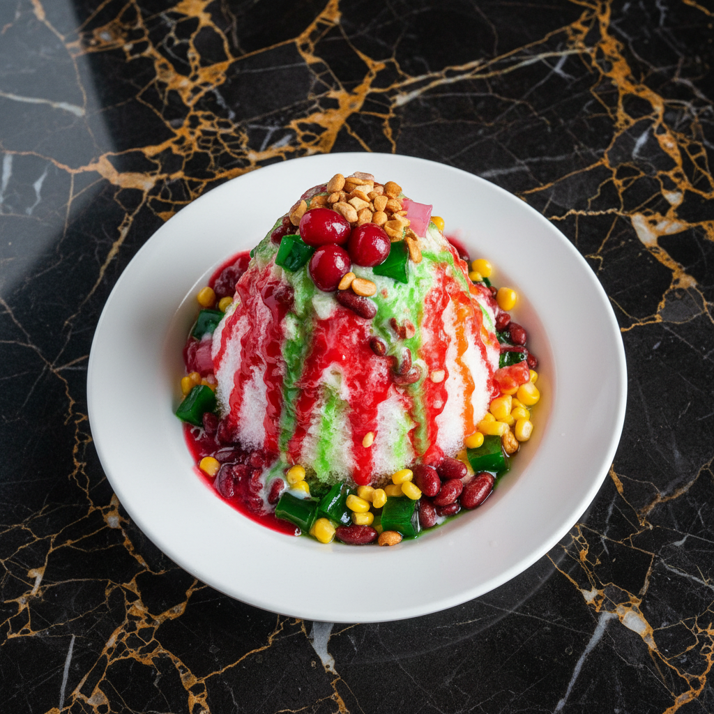 A vibrant and refreshing Malaysian shaved ice dessert, traditionally layered with sweet beans, corn, grass jelly, and drizzled with colorful syrups. A delightful treat perfect for hot weather.