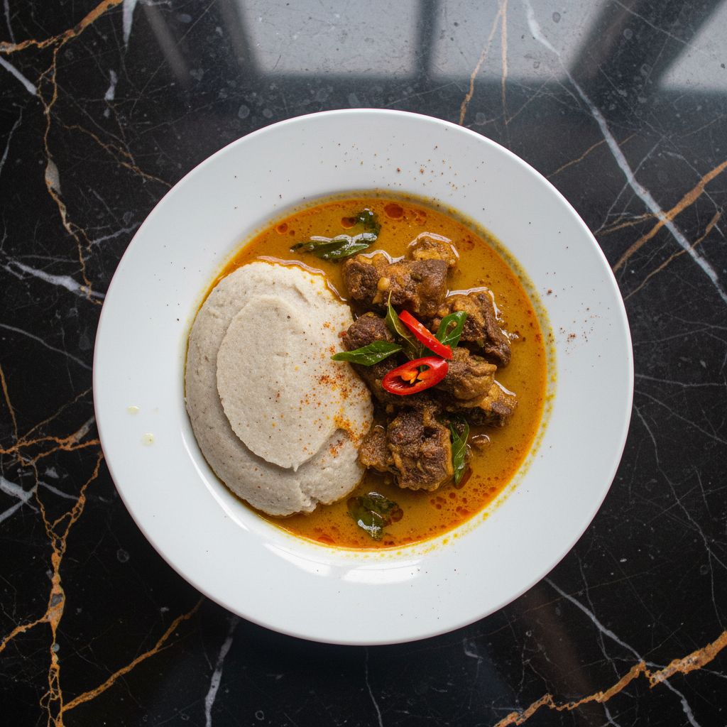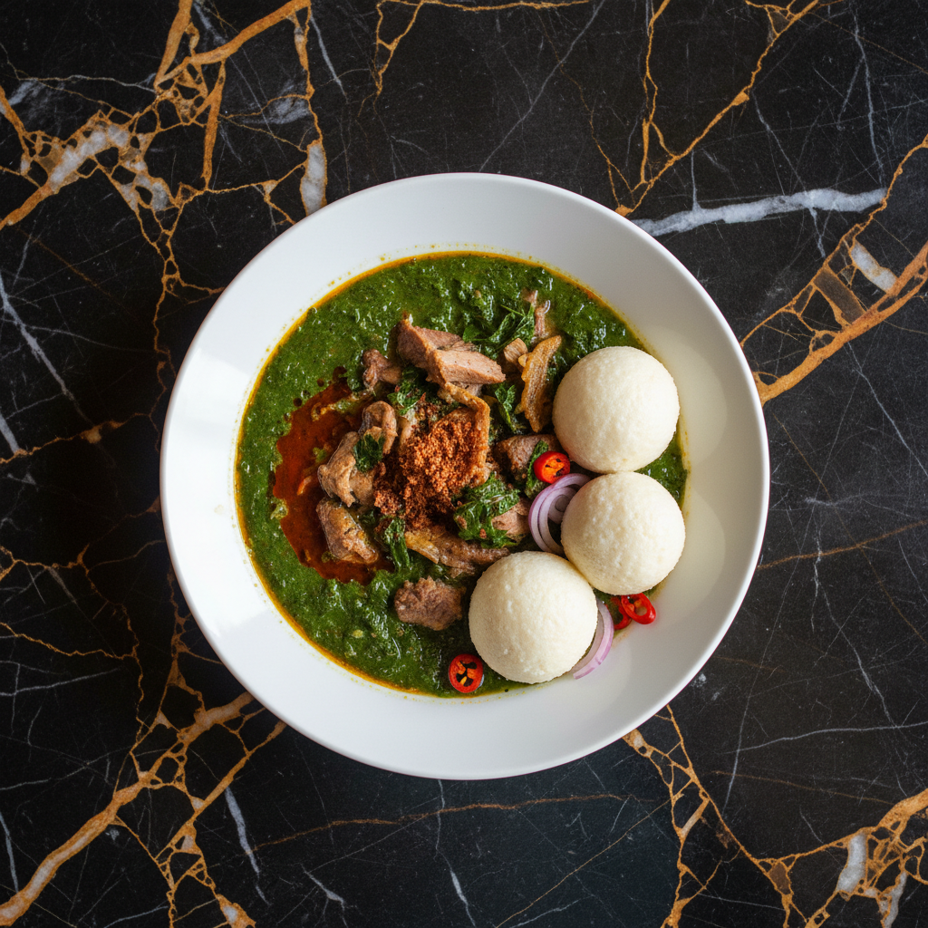 A beloved Cameroonian dish, Achu is made from pounded cocoyams (taro) forming a smooth, dough-like consistency. It is traditionally served with a vibrant 'yellow soup' made from palm oil, meat stock, and a unique blend of spices, creating a hearty and flavorful meal.