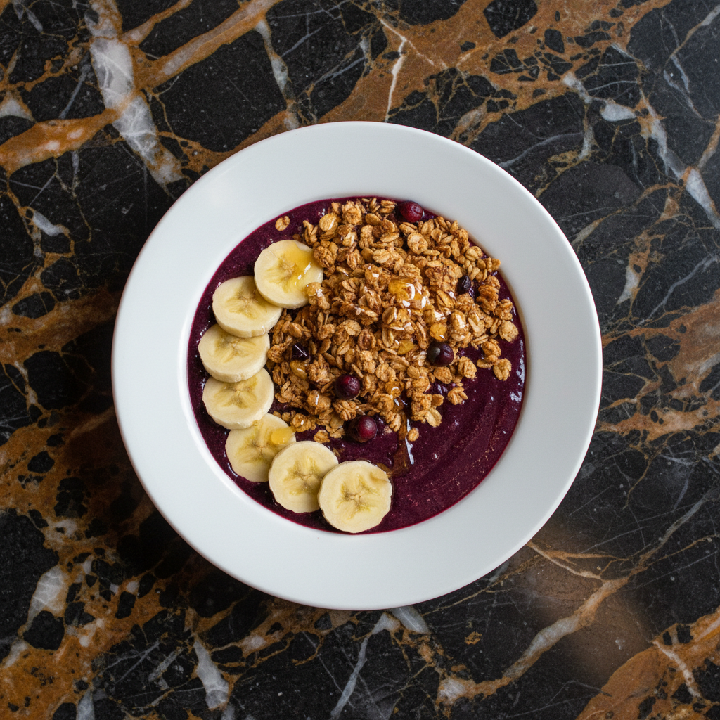 A vibrant and refreshing Brazilian açaí bowl, perfect as an energizing breakfast, snack, or post-workout treat. It features a thick, blended base of frozen açaí berries, complemented by sweet banana and a touch of guarana syrup or honey, all topped with crunchy granola and fresh banana slices.