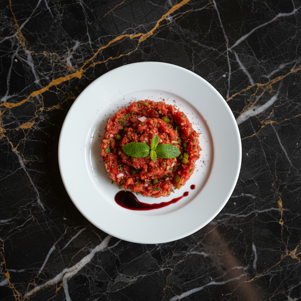 Acılı Ezme is a vibrant and intensely flavorful Turkish meze (appetizer) or side dish. It's a finely chopped salad made from ripe tomatoes, crisp peppers, and pungent onion, bound together with spicy pepper paste and aromatic herbs. Traditionally served with grilled meats (kebabs) and warm bread, it offers a refreshing yet zesty contrast.