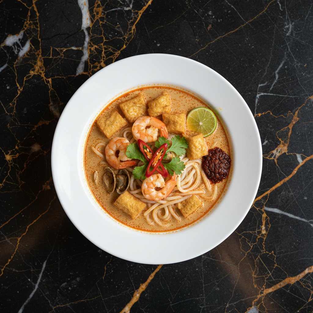 A fragrant and rich noodle soup featuring a spicy coconut-based broth, often enriched with shrimp stock. It's typically served with thick rice noodles and a variety of toppings such as prawns, fish cakes, tofu puffs, and bean sprouts.