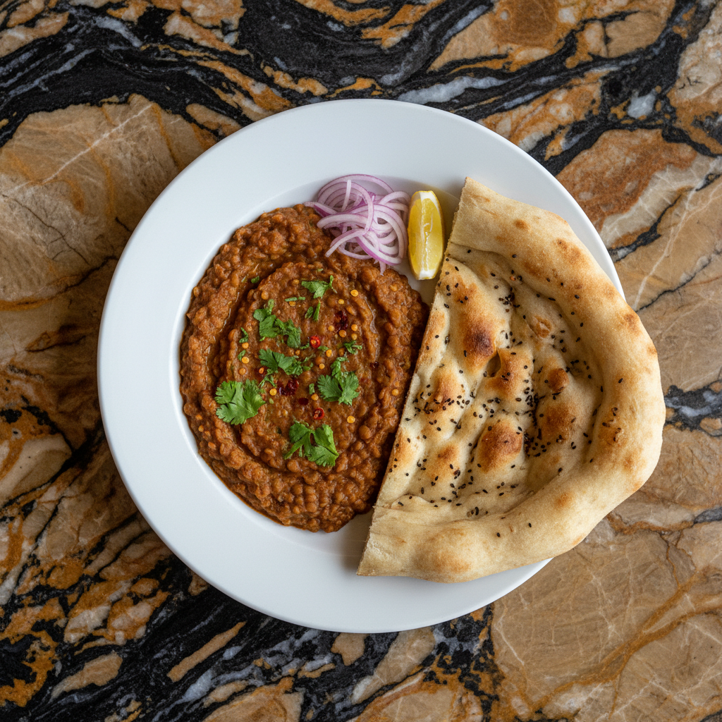 A comforting and hearty lentil stew (dal) served with a side of freshly baked Afghan bread (nan). This dish is a staple in many Afghan households, often enjoyed for breakfast or a light lunch.