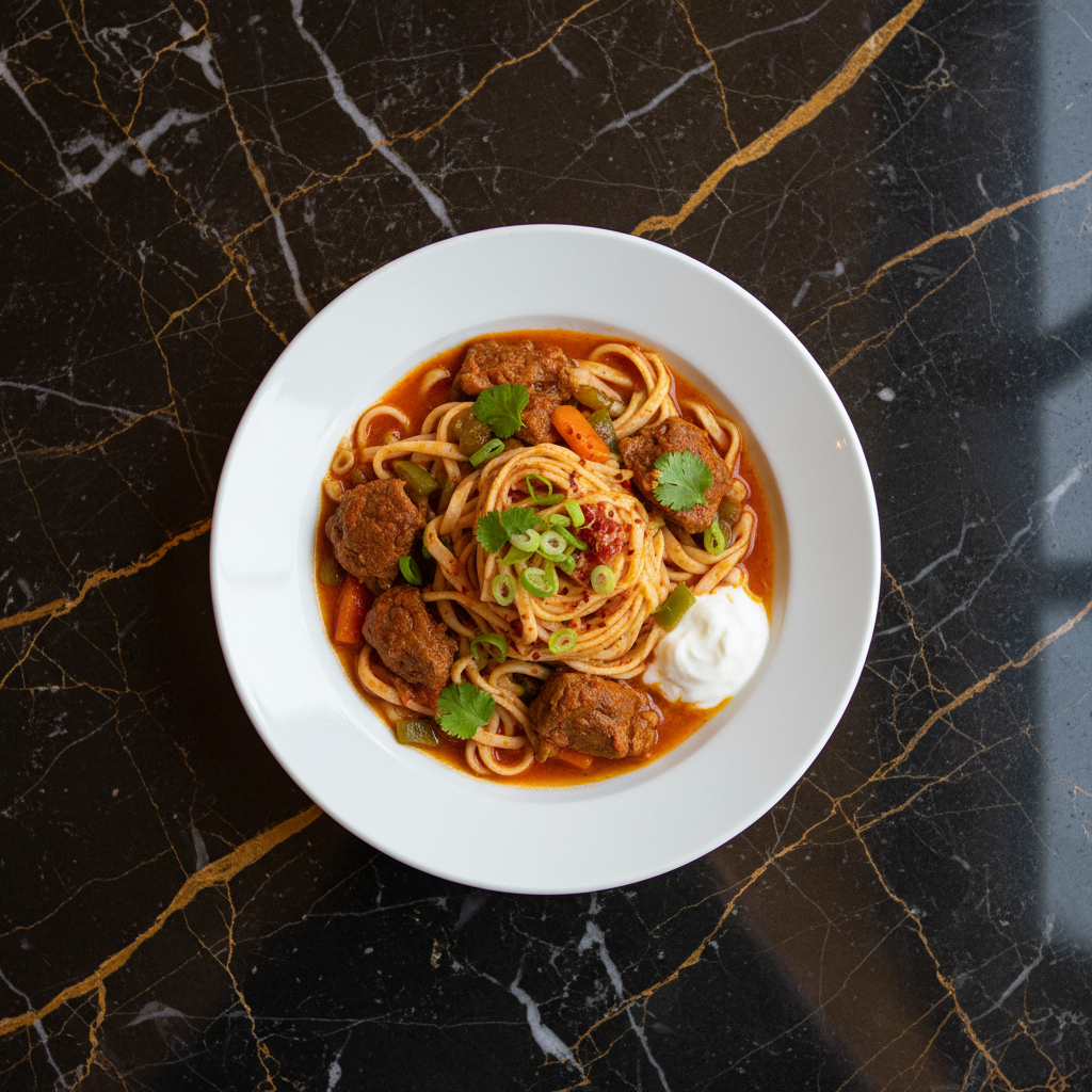 A hearty and flavorful Central Asian noodle dish, popular in Afghanistan, featuring hand-pulled noodles served in a rich, savory stew of lamb or beef with vegetables and a tomato-based sauce.