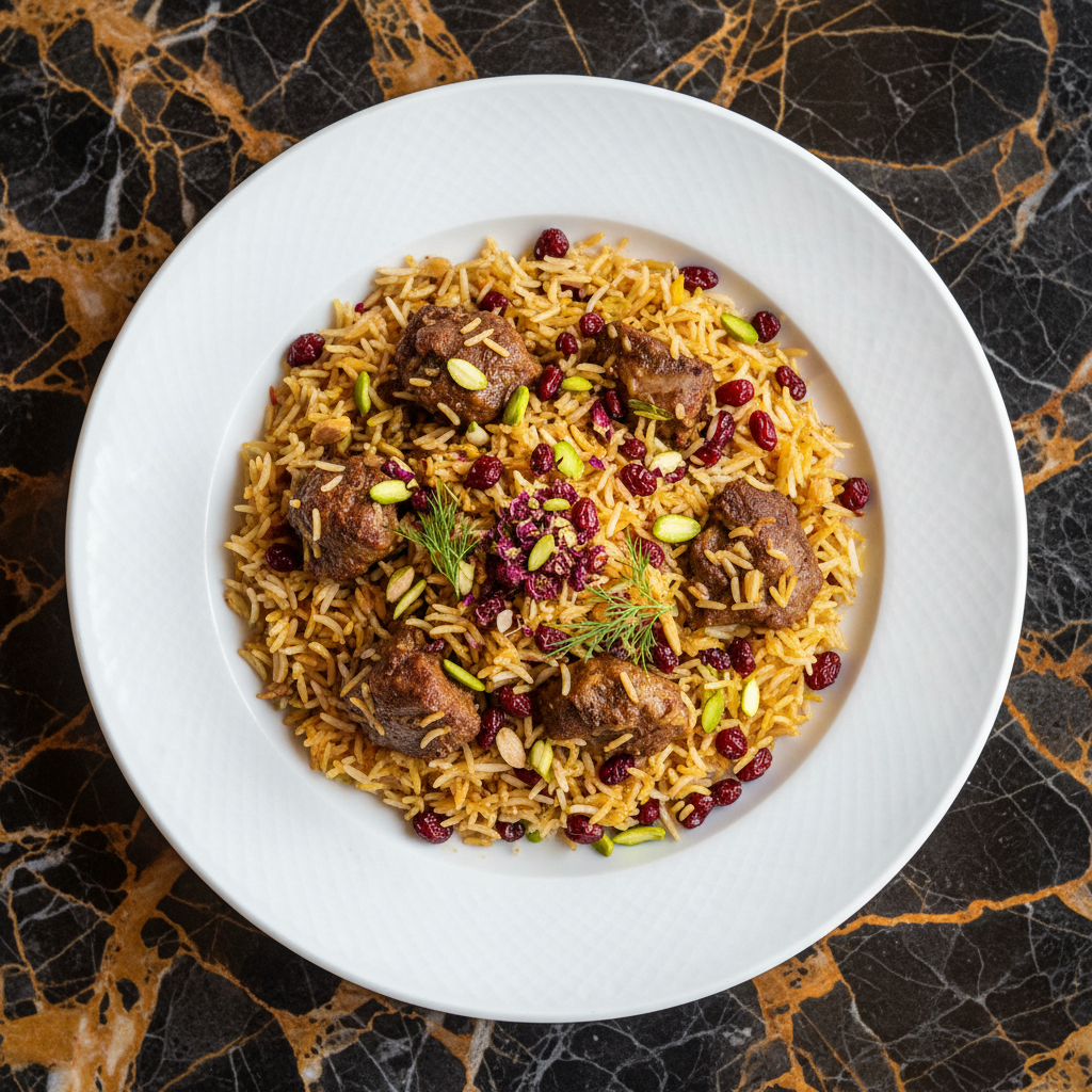 A fragrant and flavorful rice dish featuring tender lamb, aromatic basmati rice, and the distinctive tartness of barberries. This dish is often prepared for special occasions and celebrations, showcasing a balance of savory and slightly sweet-sour flavors.