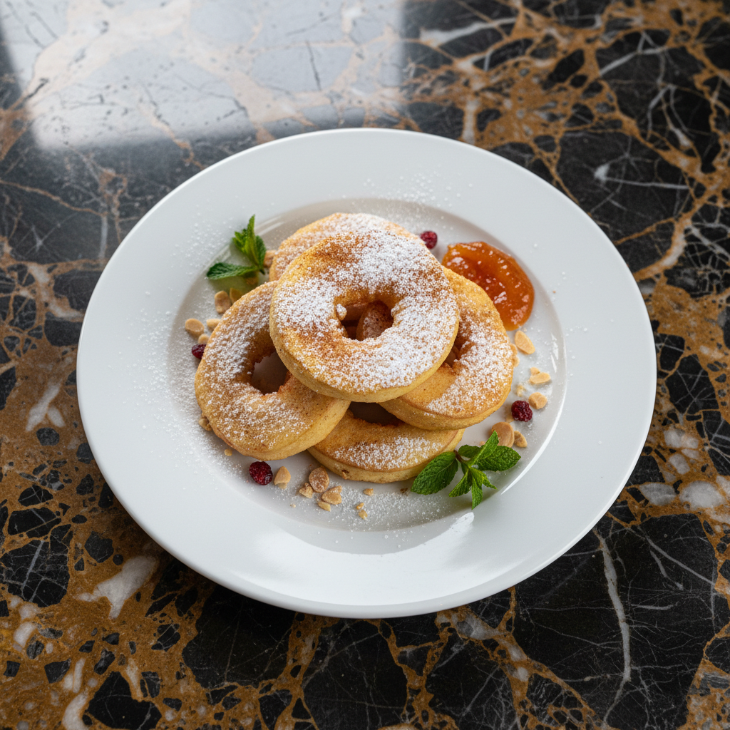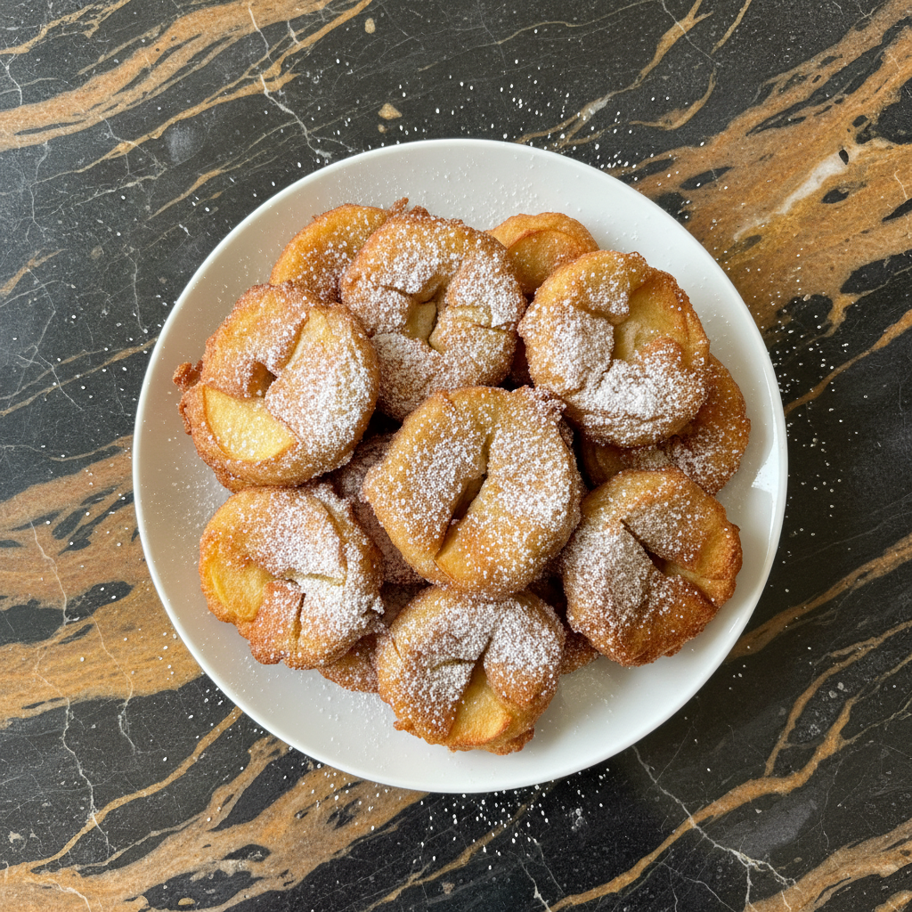Golden, crispy fritters made from slices of apple coated in a light, sweet batter and fried until golden brown. Often dusted with powdered sugar.