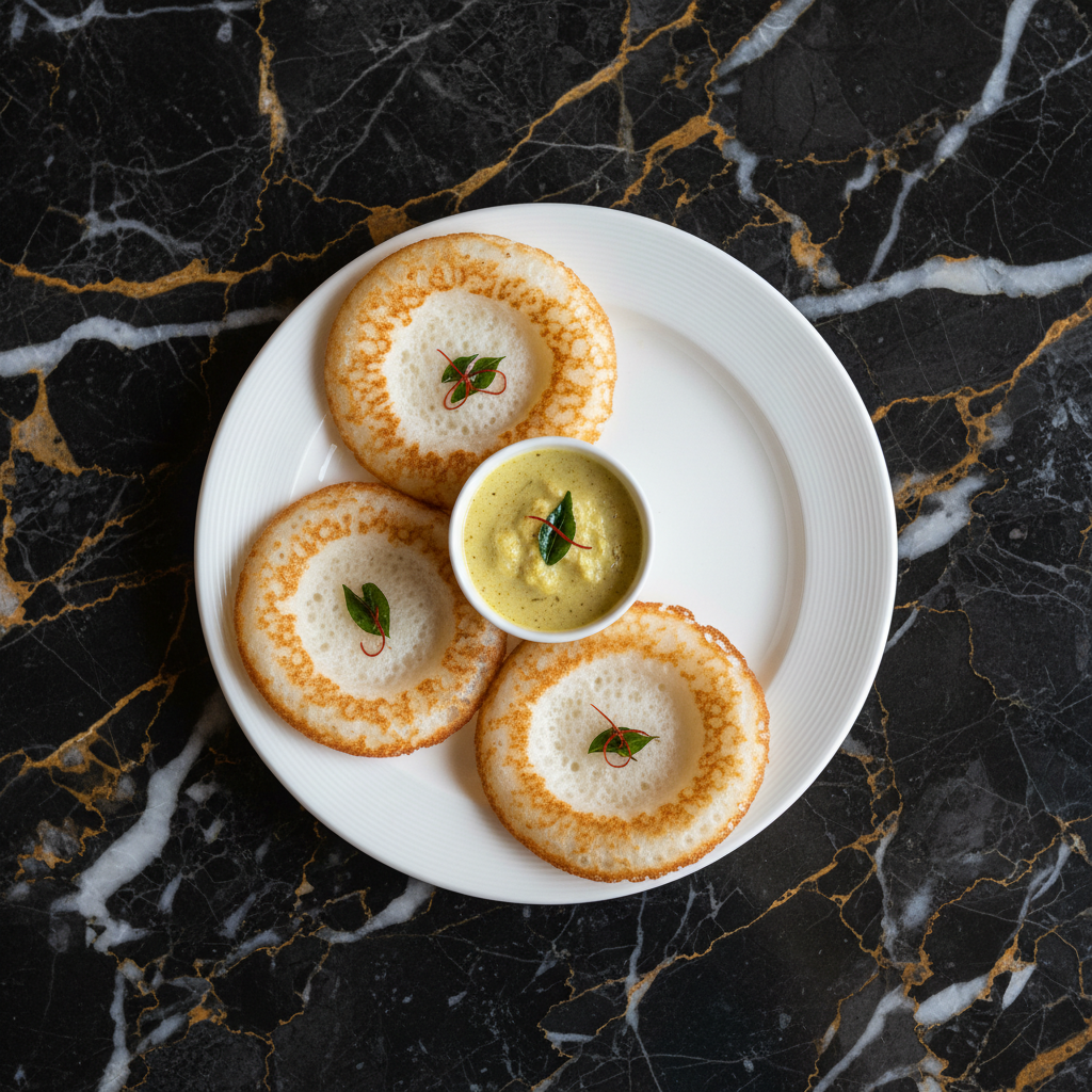 Appam are delicate, bowl-shaped fermented rice pancakes, a specialty of Kerala, India. They are characterized by their crispy, lacy edges and a soft, spongy center. Traditionally served with curries or stews.