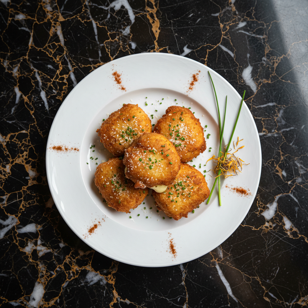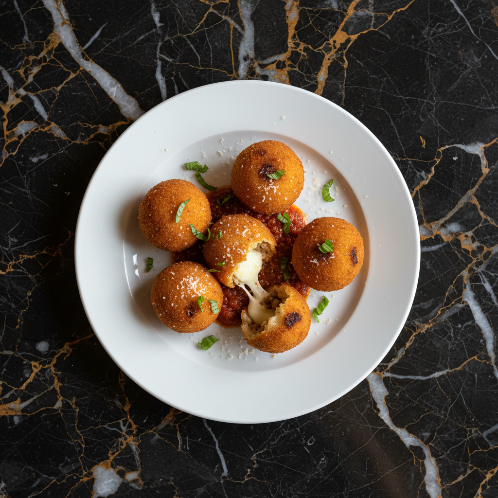 Crispy, golden-fried rice balls from Sicily, traditionally made with leftover risotto, filled with a savory ragù, sweet peas, and melting mozzarella. A perfect appetizer or street food delight.