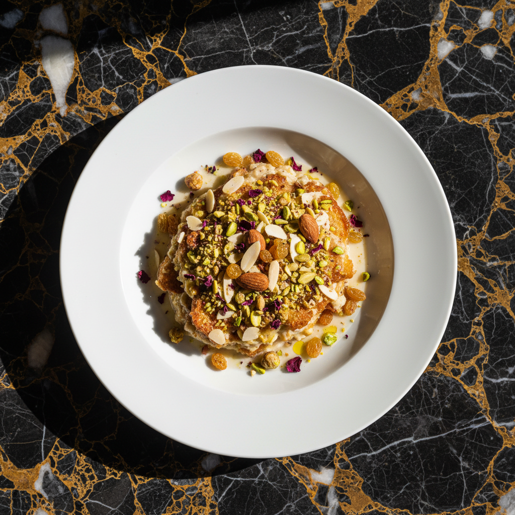 A rich and creamy dessert made with layers of toasted bread soaked in a sweet milk mixture, often flavored with rose water and orange blossom water, and topped with nuts.