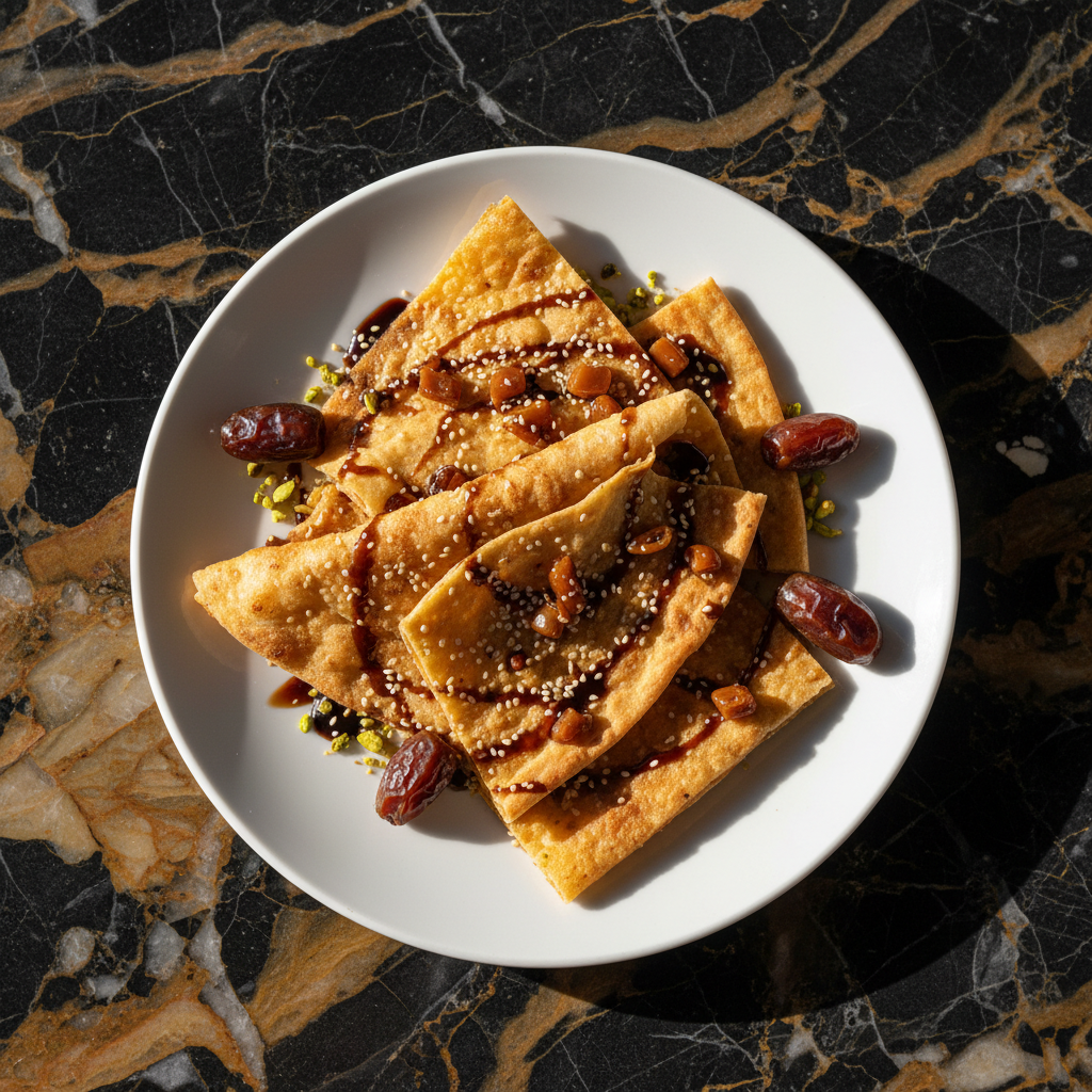 Regag is a thin, crispy Arabic flatbread, often enjoyed for breakfast or as a snack. It's made from a simple batter of wheat flour, dates, and water, cooked on a hot griddle.