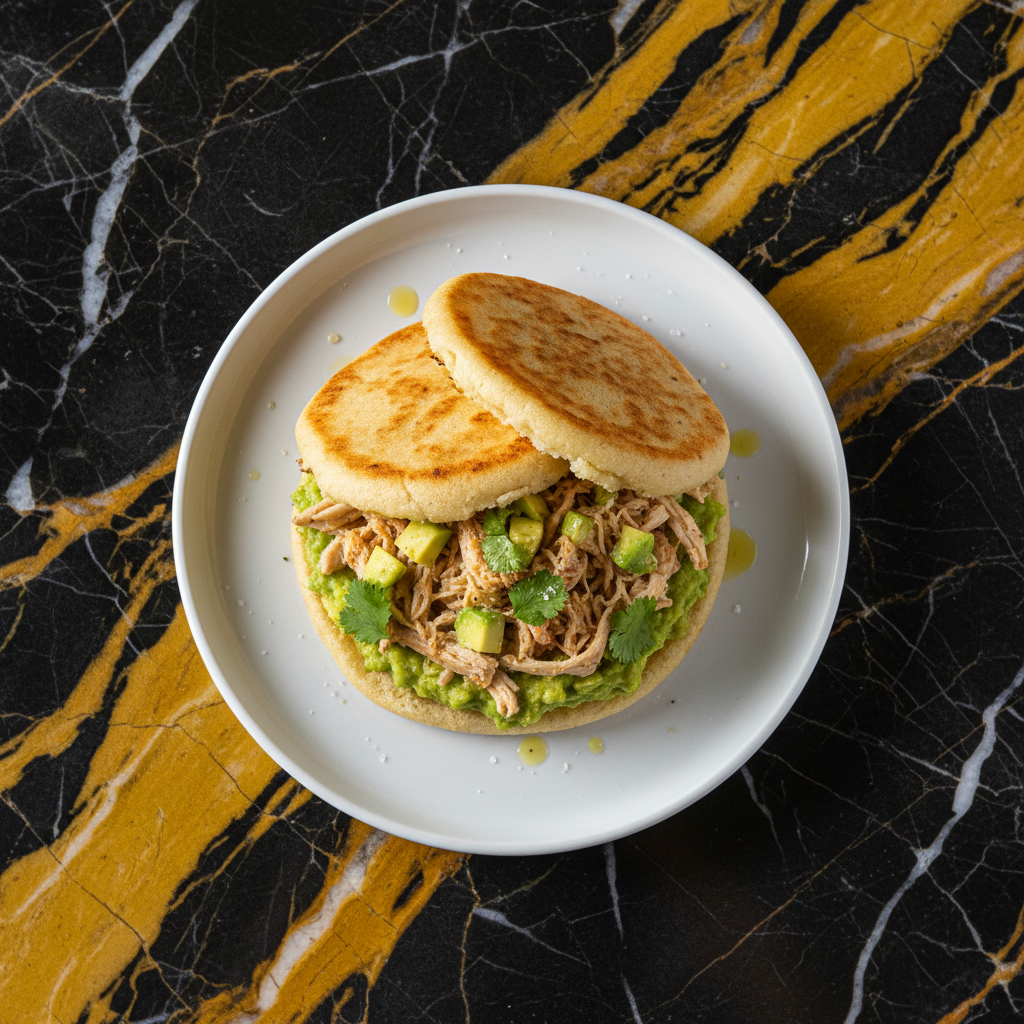 Venezuela's iconic 'Queen Arepa' – a perfectly grilled corn patty, split and generously stuffed with a creamy mixture of shredded chicken, ripe avocado, and mayonnaise. Named in honor of Susana Duijm, Miss World 1955.