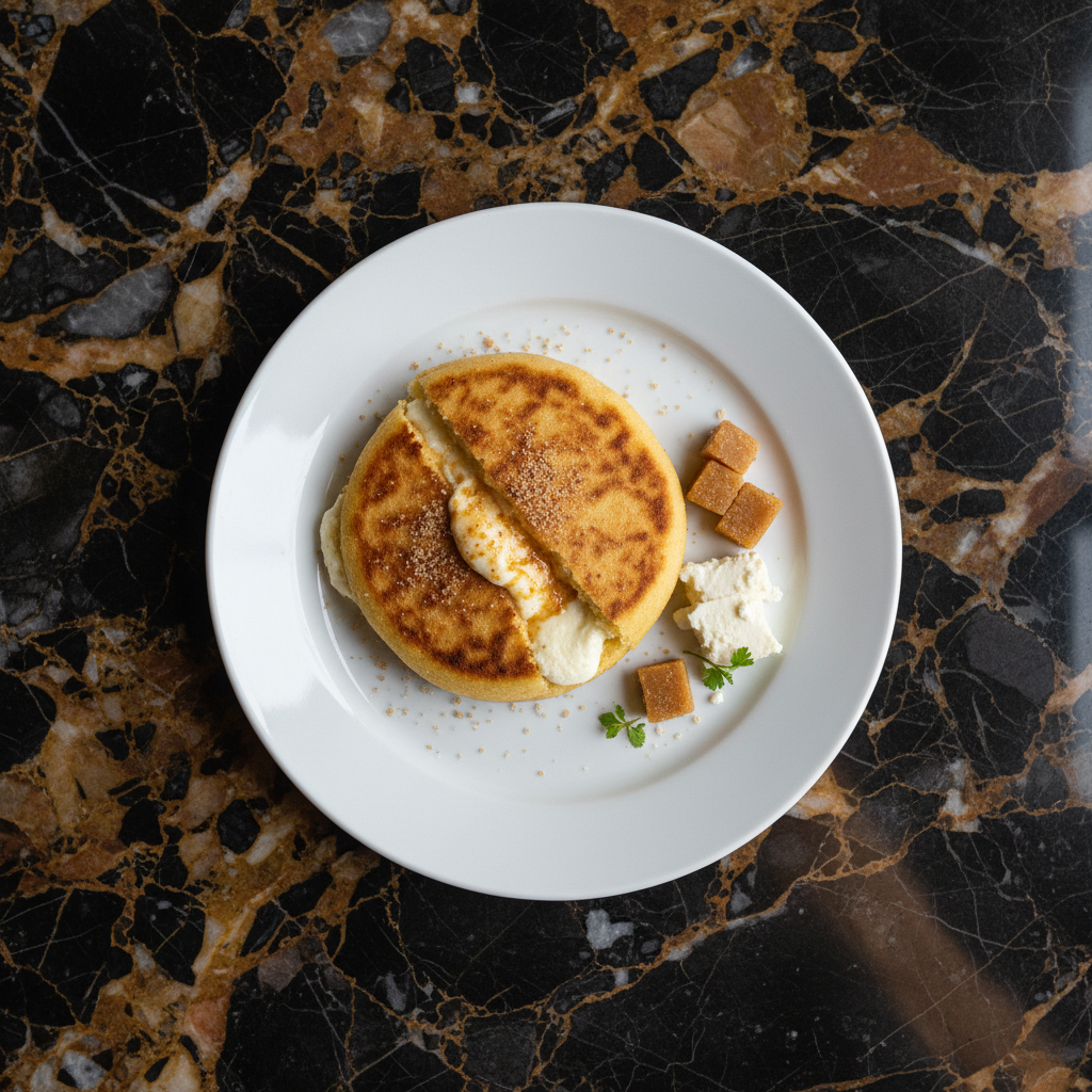 A traditional sweet corn and wheat flour arepa from the Boyacá region of Colombia, filled with creamy cuajada cheese and sweetened with panela.
